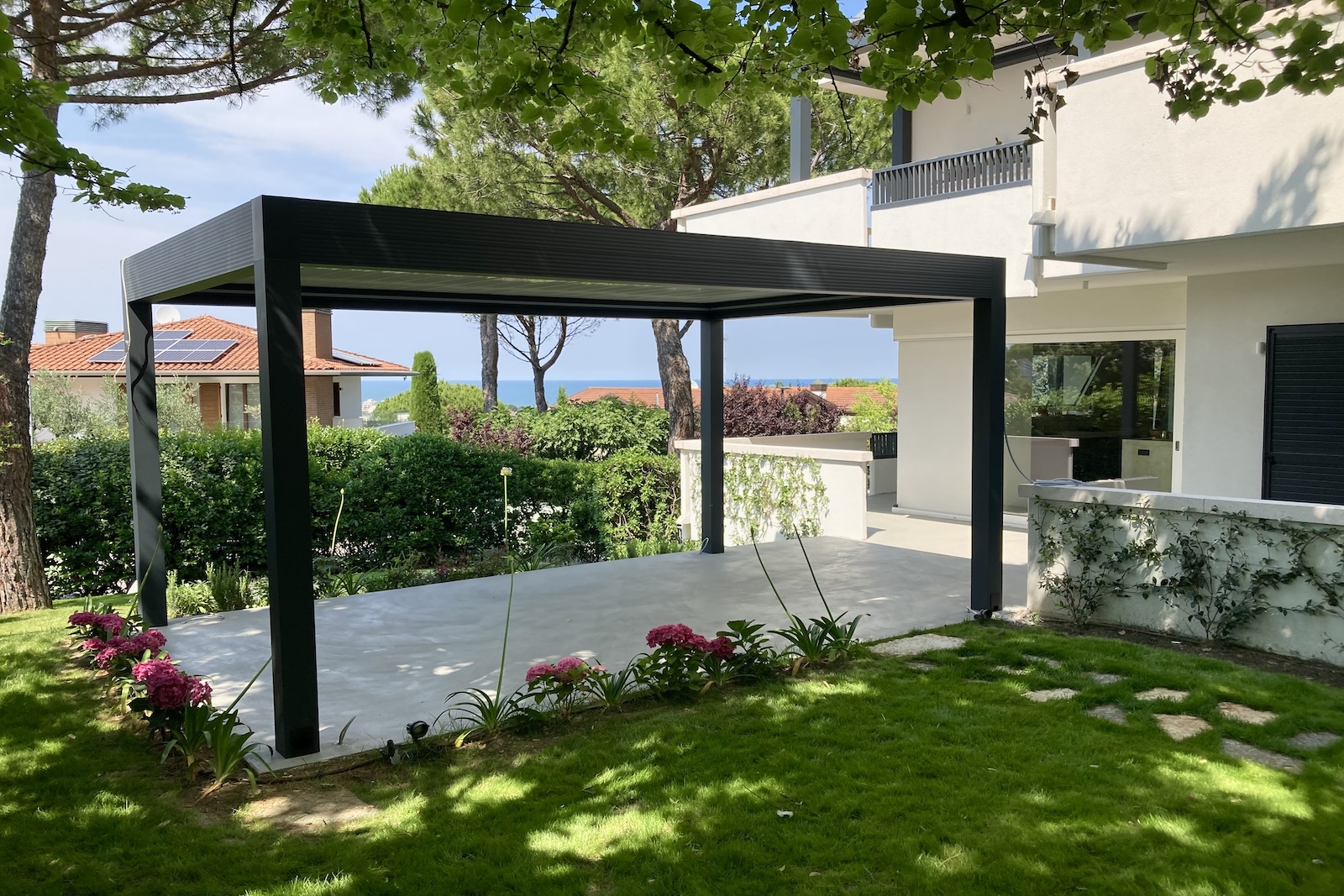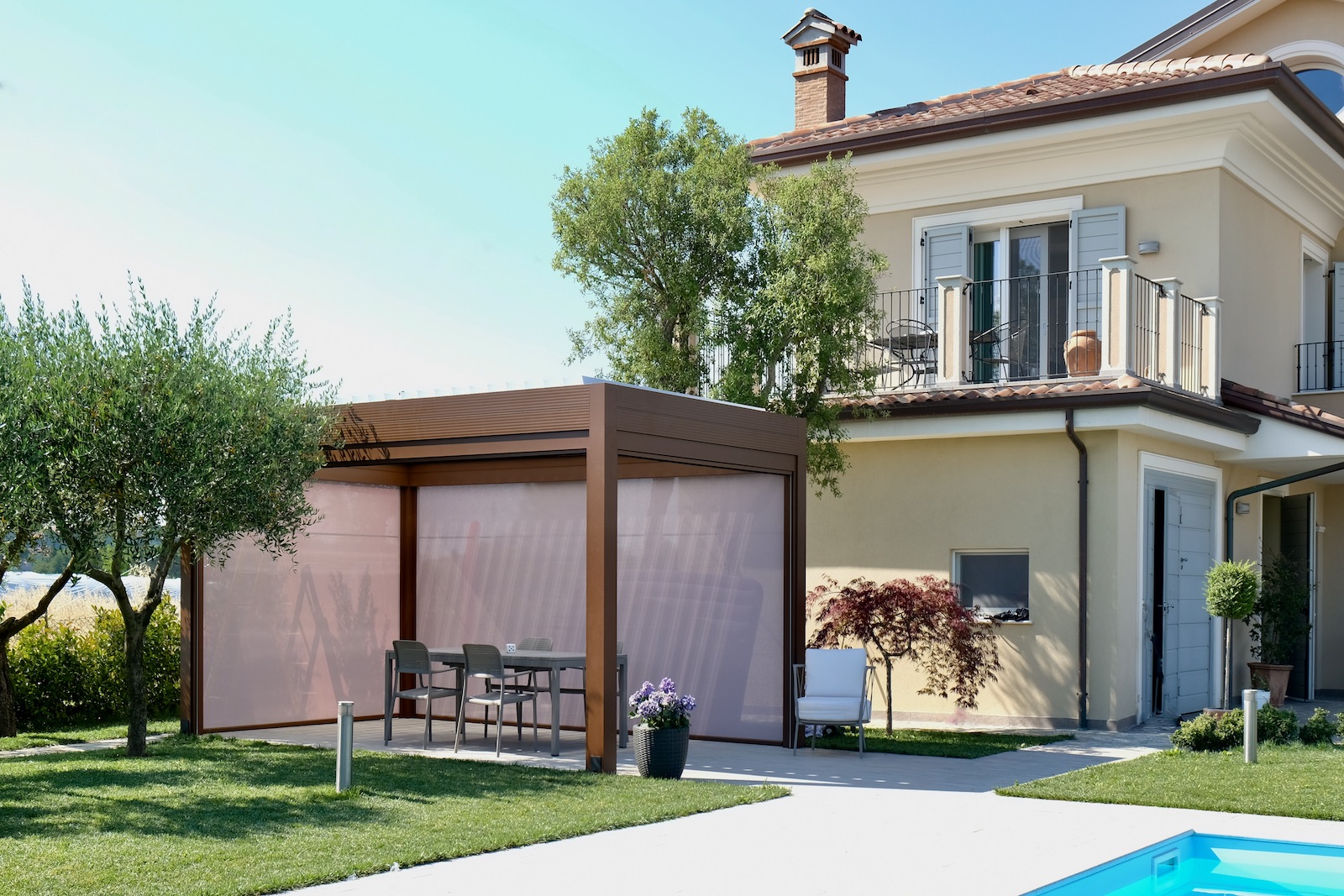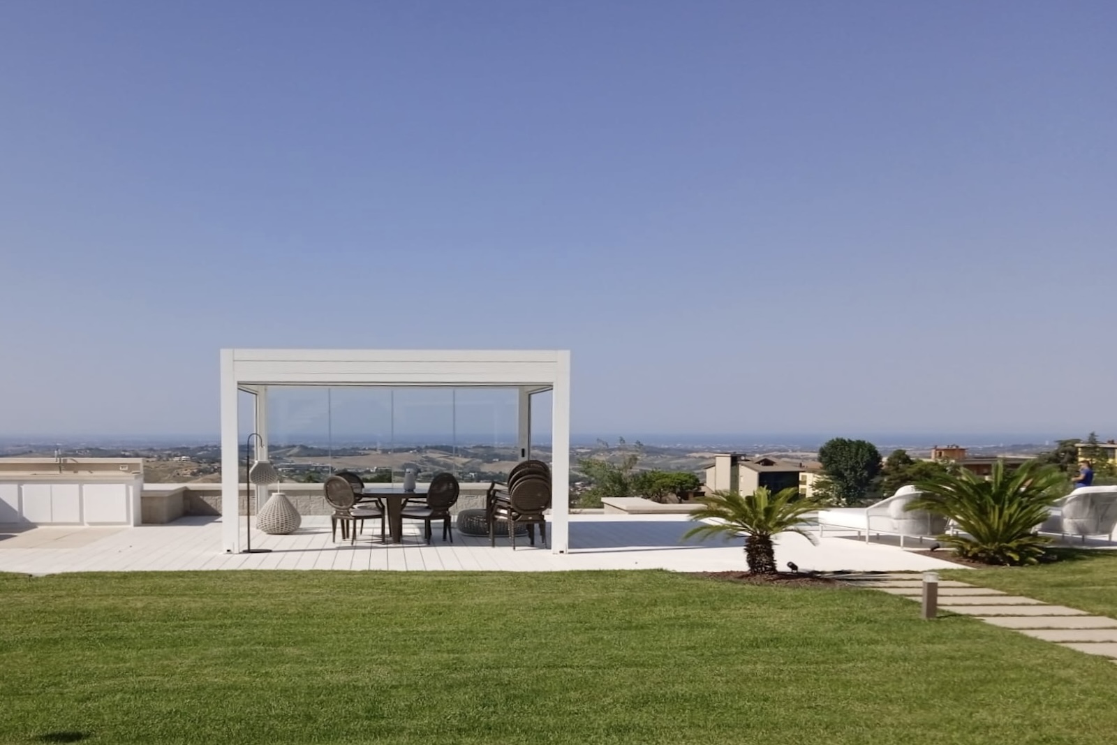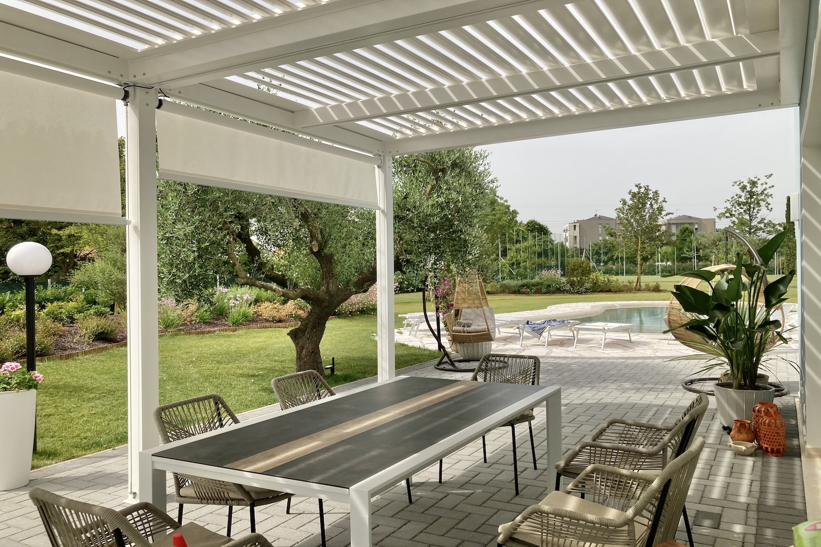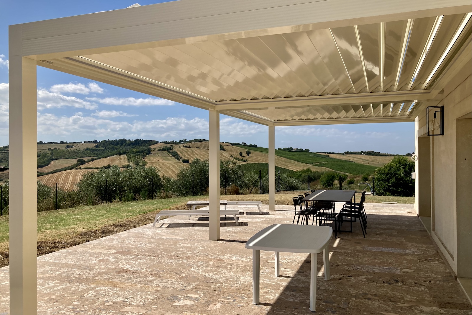 Le Pergole Bioclimatiche hanno la capacità di regolare il microclima dell'ambiente sottostante creando una ventilazione naturale. Le lame in alluminio sono movimentate da un motore silenzioso e possono ruotare dalla posizione orizzontale che garantisce una tenuta ottimale alla pioggia, a quella di apertura , secondo un angolo variabile da 0° a 135°.