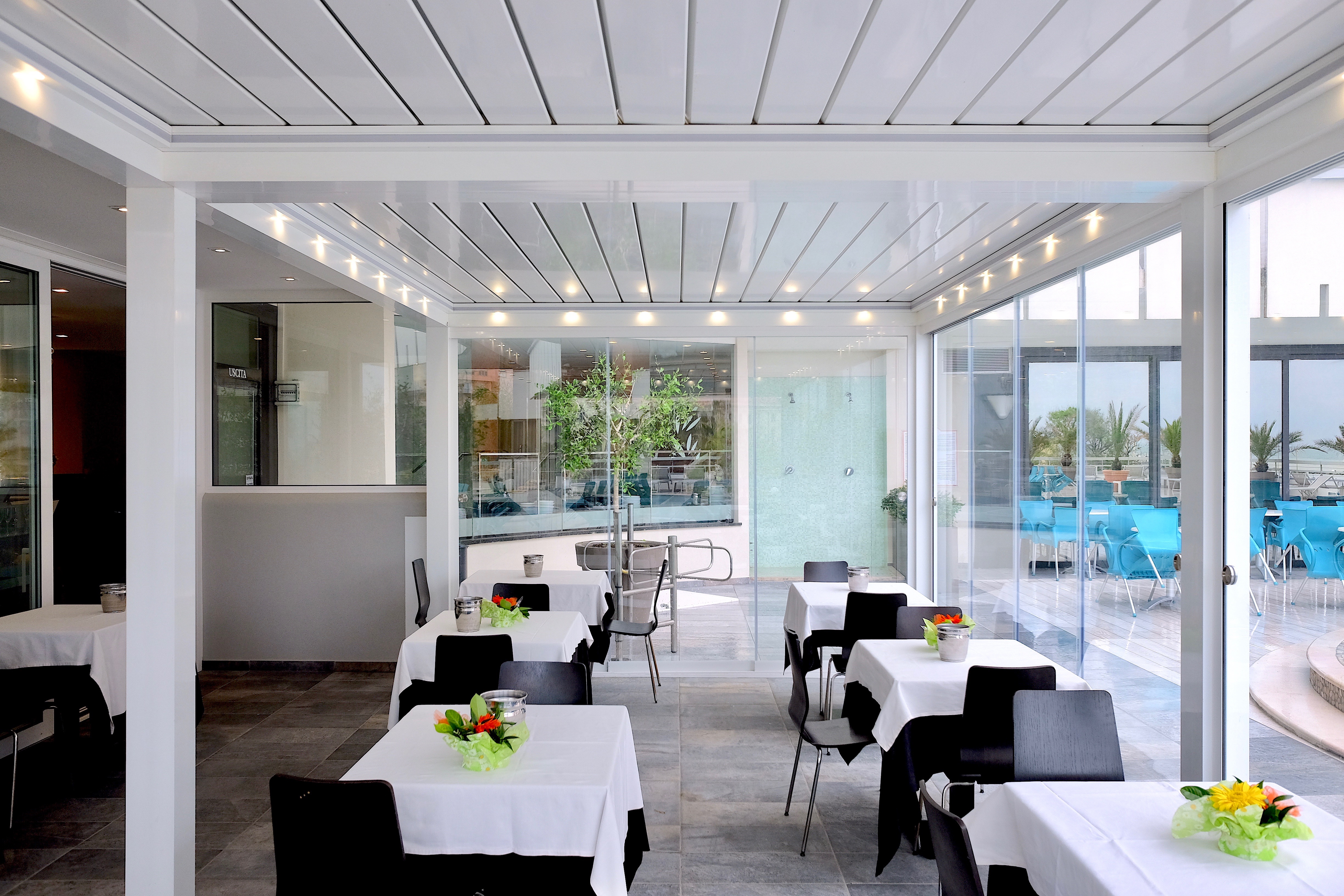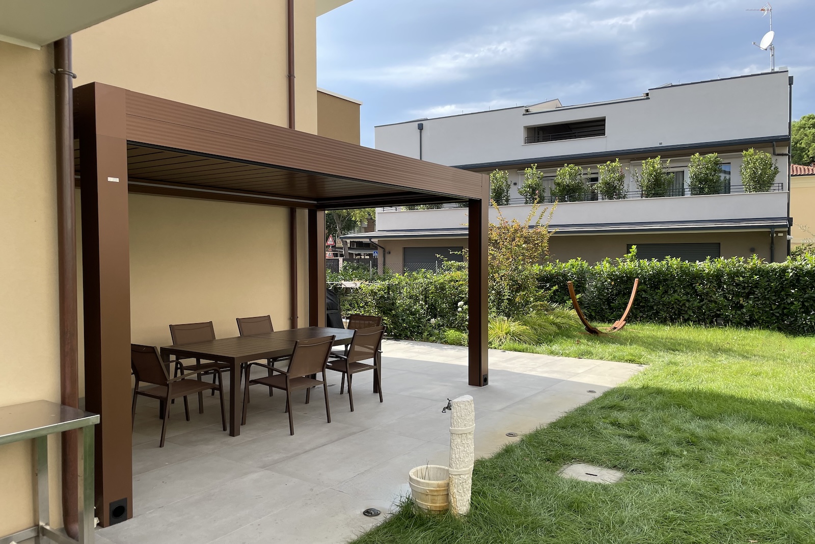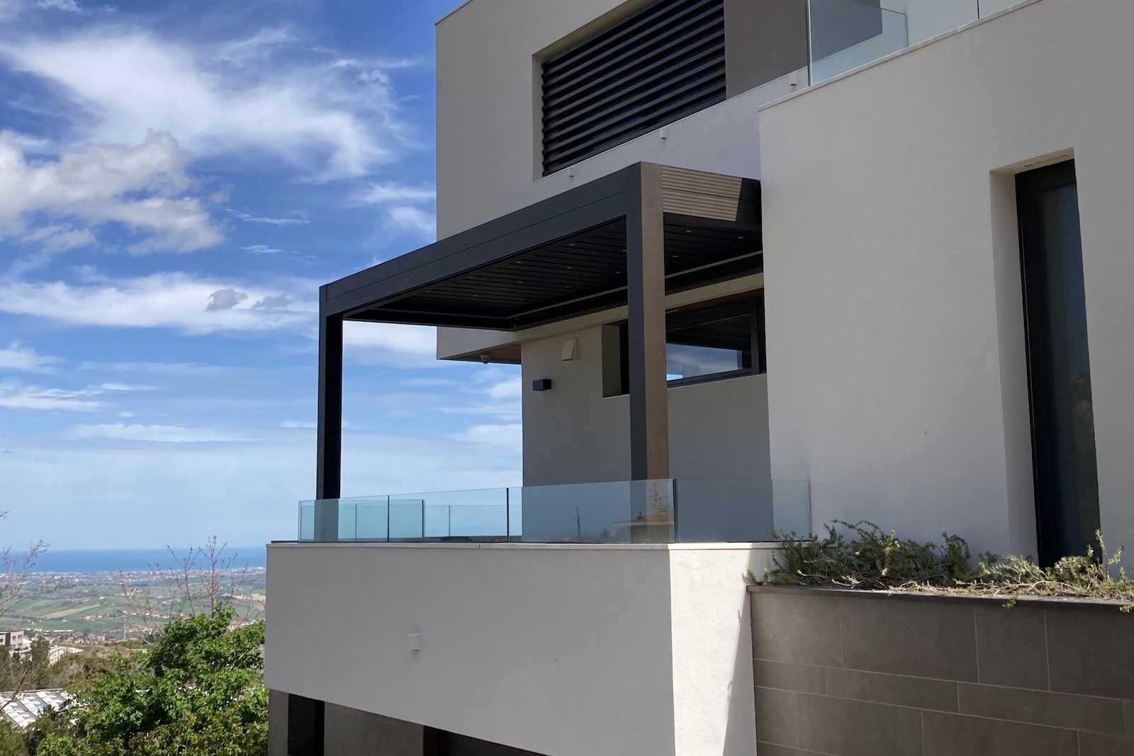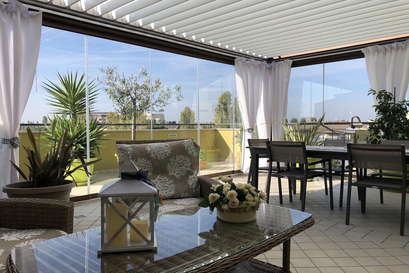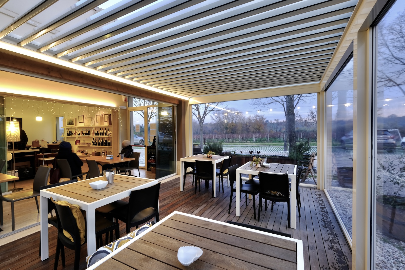 Le Pergole Bioclimatiche hanno la capacità di regolare il microclima dell'ambiente sottostante creando una ventilazione naturale. Le lame in alluminio sono movimentate da un motore silenzioso e possono ruotare dalla posizione orizzontale che garantisce una tenuta ottimale alla pioggia, a quella di apertura , secondo un angolo variabile da 0° a 135°.